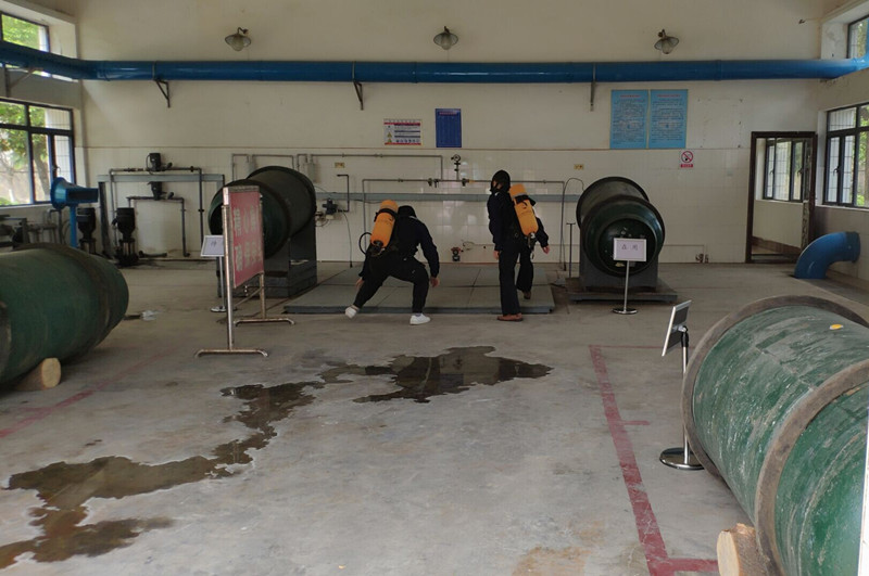 演練開始前,三水廠負(fù)責(zé)人對全廠職工進行了防火滅火知識培訓(xùn),并安排專人詳細(xì)講解了消防水袋、滅火器和呼吸機的使用方法?;顒又校瑓⒀萑藛T還分批次進行了滅火和漏氯預(yù)防實戰(zhàn)演練。