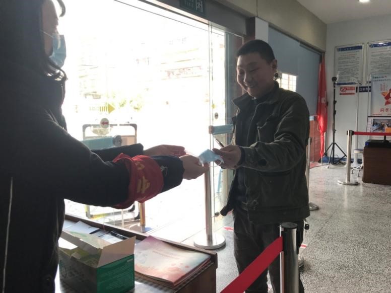 “請留步稍等!我們這邊將自己的備用口罩,送您一只!疫情還未結束,防疫不能放松。下次進大廳請您記得一定要佩戴口罩!”