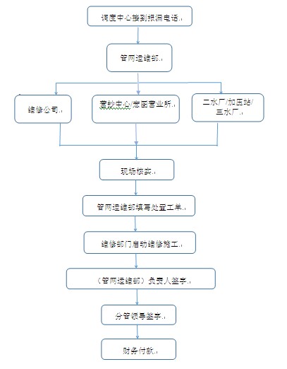 3、市政管網(wǎng):管網(wǎng)運(yùn)維部聯(lián)系維修公司(或營(yíng)抄中心、宏圖營(yíng)業(yè)所);原水管道:管網(wǎng)運(yùn)維部聯(lián)系二水廠(或加壓站、三水廠);