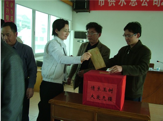 4月26日,荊門市供水總公司舉行“情系玉樹 大愛無疆“捐款活動,供水職工慷慨解囊、捐款踴躍,短短的時間,共募得善款18170元,圖為捐款現(xiàn)場場景。