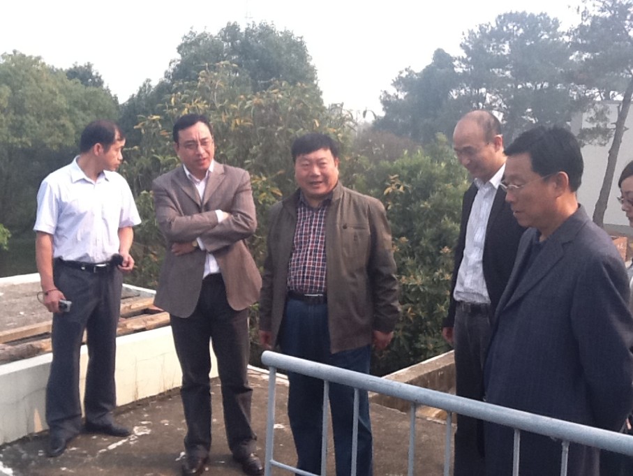 10月21日,省物價局環(huán)境與資源價格處吳賢武處長(左三)、成本調(diào)查監(jiān)審分局吳勤民科長(左二)在市物價局局長汪順彪(右二)、總公司黨委書記陳永根(右三)陪同下視察市二水廠。