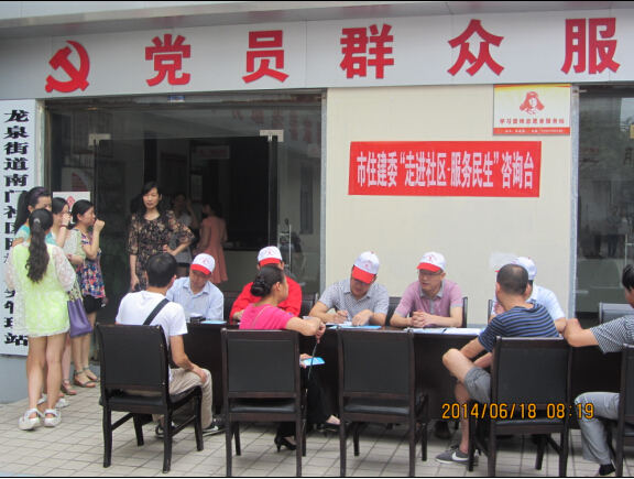 市供水總公司黨委書記陳永根(左二)在“走進(jìn)社區(qū)、服務(wù)民生,走進(jìn)企業(yè)、服務(wù)發(fā)展”活動(dòng)中,深入龍泉街辦南門社區(qū)傾聽用戶呼聲,辦實(shí)事,解難題。