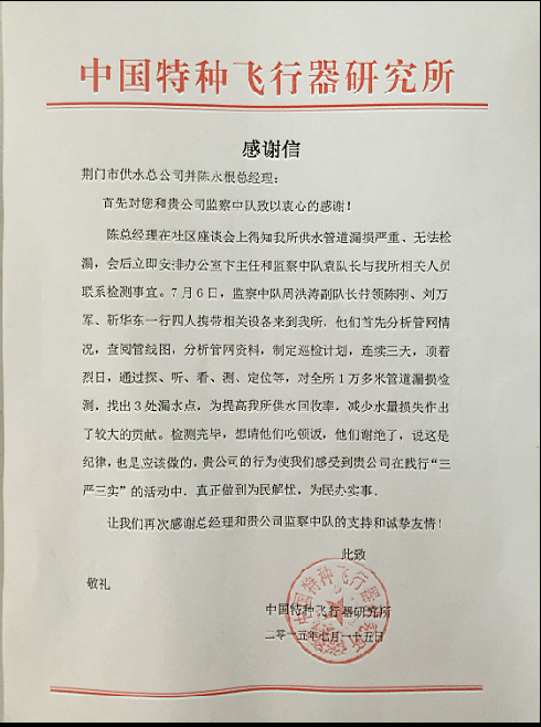 7月28日,605所相關(guān)負責(zé)人一行2人專程到公司送上“全心全意服務(wù)企業(yè)”錦旗和一封感謝信,表達公司免費為其探測漏、減少其水量損失的謝意。