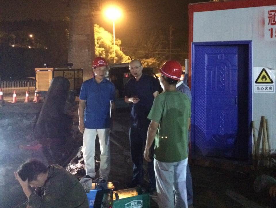此次施工任務(wù)重、時(shí)間緊、戰(zhàn)線長(zhǎng)、交叉作業(yè)多、未知因素多,市供水總公司科學(xué)組織、準(zhǔn)備充分、措施有力,創(chuàng)造了荊門(mén)供水單次停水施工碰頭數(shù)量最多、停水時(shí)間最短的歷史紀(jì)錄!此次施工前,市供水總公司審時(shí)度勢(shì),啟動(dòng)了應(yīng)急預(yù)案,從人員、物資、設(shè)備、應(yīng)急搶險(xiǎn)等各方面都做了充分準(zhǔn)備。當(dāng)晚,公司黨委書(shū)記、總經(jīng)理陳永根親臨施工現(xiàn)場(chǎng),坐鎮(zhèn)一線指揮,要求相關(guān)部門(mén)集中力量,全力配合,爭(zhēng)取在最短的時(shí)間內(nèi)完成施工,盡快恢復(fù)供水。在爭(zhēng)分奪秒的施工過(guò)程中,全體參戰(zhàn)單位和人員在總公司領(lǐng)導(dǎo)正確指揮下,發(fā)揚(yáng)"特別能吃苦、特別能戰(zhàn)斗、特別能奉獻(xiàn)"的“供水鐵軍”精神,團(tuán)結(jié)一心,眾志成城,密切配合,群策群力,譜寫(xiě)了供水人敢與時(shí)間賽跑、敢同困難較勁的“合奏曲”。維修公司、安裝公司、營(yíng)抄中心工作人員作為搶修主力軍,在悶熱的坑洞下和污濁的泥水中實(shí)行分班作業(yè)、輪流施工,艱苦作業(yè)。職能部門(mén)管網(wǎng)運(yùn)維部、工程管理部、客服中心、水質(zhì)檢測(cè)公司積極發(fā)揮統(tǒng)籌協(xié)調(diào)能力,調(diào)度應(yīng)急供水車緊急供水、調(diào)配管材物質(zhì)、快速水質(zhì)化驗(yàn)……竭盡全力地為DN1000管道碰頭施工保駕護(hù)航。