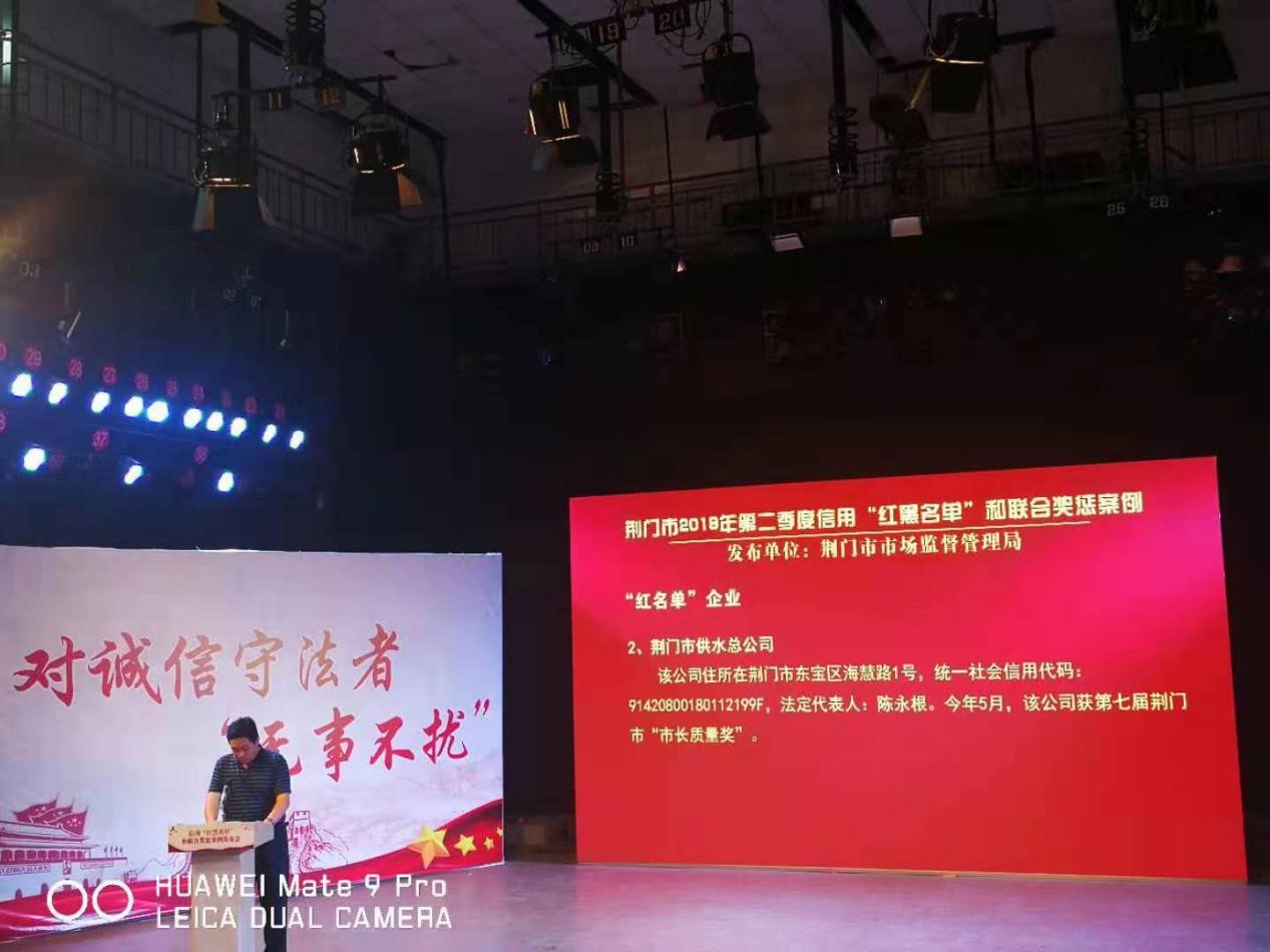 7月24日下午,荊門市社會信用體系建設(shè)領(lǐng)導(dǎo)小組辦公室、市發(fā)改委、人行荊門市中心支行聯(lián)合組織召開第二季度信用“紅黑名單”和聯(lián)合獎懲案例發(fā)布會。會上,市供水總公司被授予“全市市場監(jiān)管領(lǐng)域守信企業(yè)”榮譽(yù)稱號,入選荊門市守信企業(yè)“紅名單”。