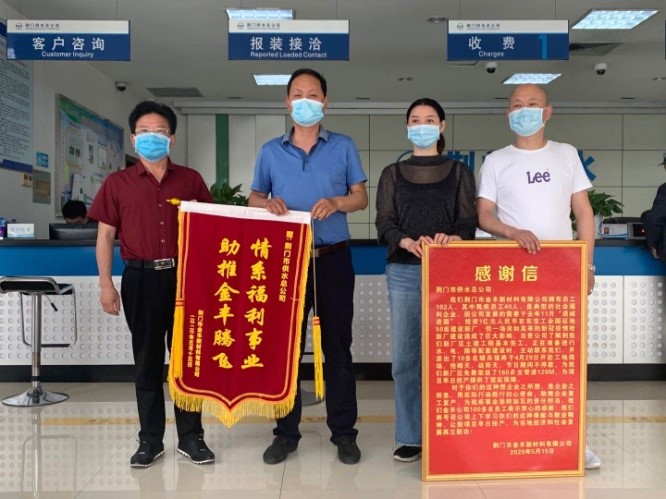 5月15日上午,荊門市金豐新材料有限公司總經(jīng)理袁家群和東寶區(qū)工商聯(lián)相關(guān)負(fù)責(zé)人來到市供水總公司,送上感謝信和寫有“情系福利事業(yè) 助推金豐騰飛”的鮮艷錦旗,以感謝市供水總公司想企業(yè)之所想、急企業(yè)之所急,用實(shí)際行動(dòng)踐行初心使命,助推企業(yè)復(fù)工復(fù)產(chǎn)。