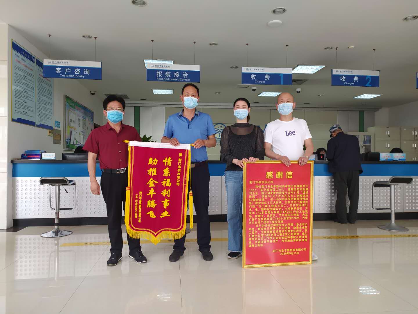 5月15日,金豐公司總經理袁家群和東寶區(qū)工商聯(lián)相關負責人來到市供水總公司,送上感謝信和寫有“情系福利事業(yè) 助推金豐騰飛”字樣的鮮艷錦旗。