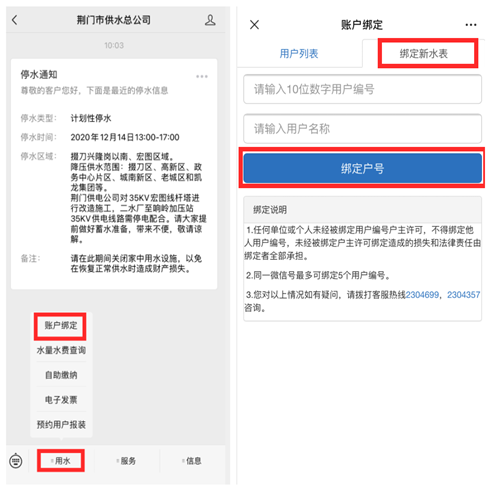 1.進(jìn)入“荊門市供水總公司”微信公眾號,點擊“用水”,選擇“賬號綁定”,點擊“綁定新水表”,輸入10位數(shù)字用戶編號、用戶名稱綁定戶號。