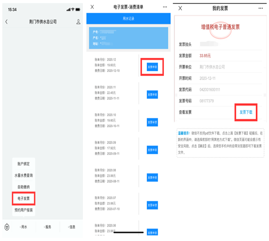 用戶在繳費成功后,只需關(guān)注“荊門市供水總公司”微信公眾號或登錄網(wǎng)上營業(yè)廳,進(jìn)入電子發(fā)票模塊,即可查詢、申領(lǐng)、下載打印水費電子發(fā)票。目前,電子發(fā)票系統(tǒng)運(yùn)行平穩(wěn)順利。