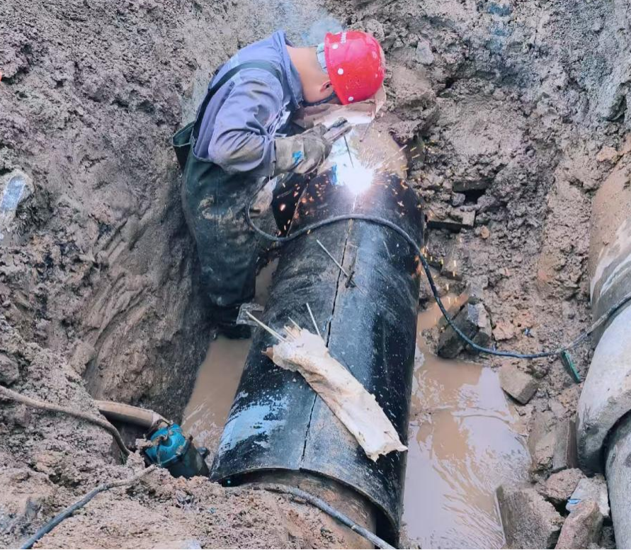 施工現(xiàn)場情況復(fù)雜,故障管道埋深達3米搶修人員頂風(fēng)冒雨,克服重重困難,加速完成管道清理、融口焊接,歷經(jīng)4小時恢復(fù)正常供水。
