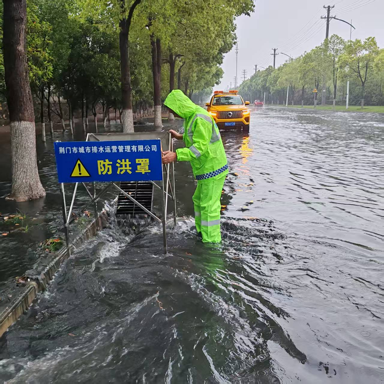 排水公司防汛人員正在開啟雨水箅蓋排水
