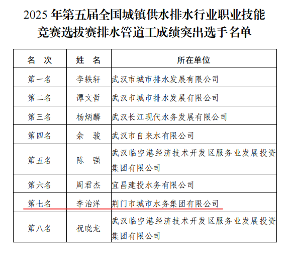 近日,荊門水務(wù)集團(tuán)成功獲評(píng)第五屆全國(guó)城鎮(zhèn)供水排水行業(yè)職業(yè)技能競(jìng)賽湖北省選拔賽道德風(fēng)尚獎(jiǎng)。集團(tuán)參賽選手不負(fù)眾望,取得佳績(jī)。詠泉公司付傳艷、余怡康榮獲個(gè)人優(yōu)秀獎(jiǎng),排水公司李治洋獲得第七名。